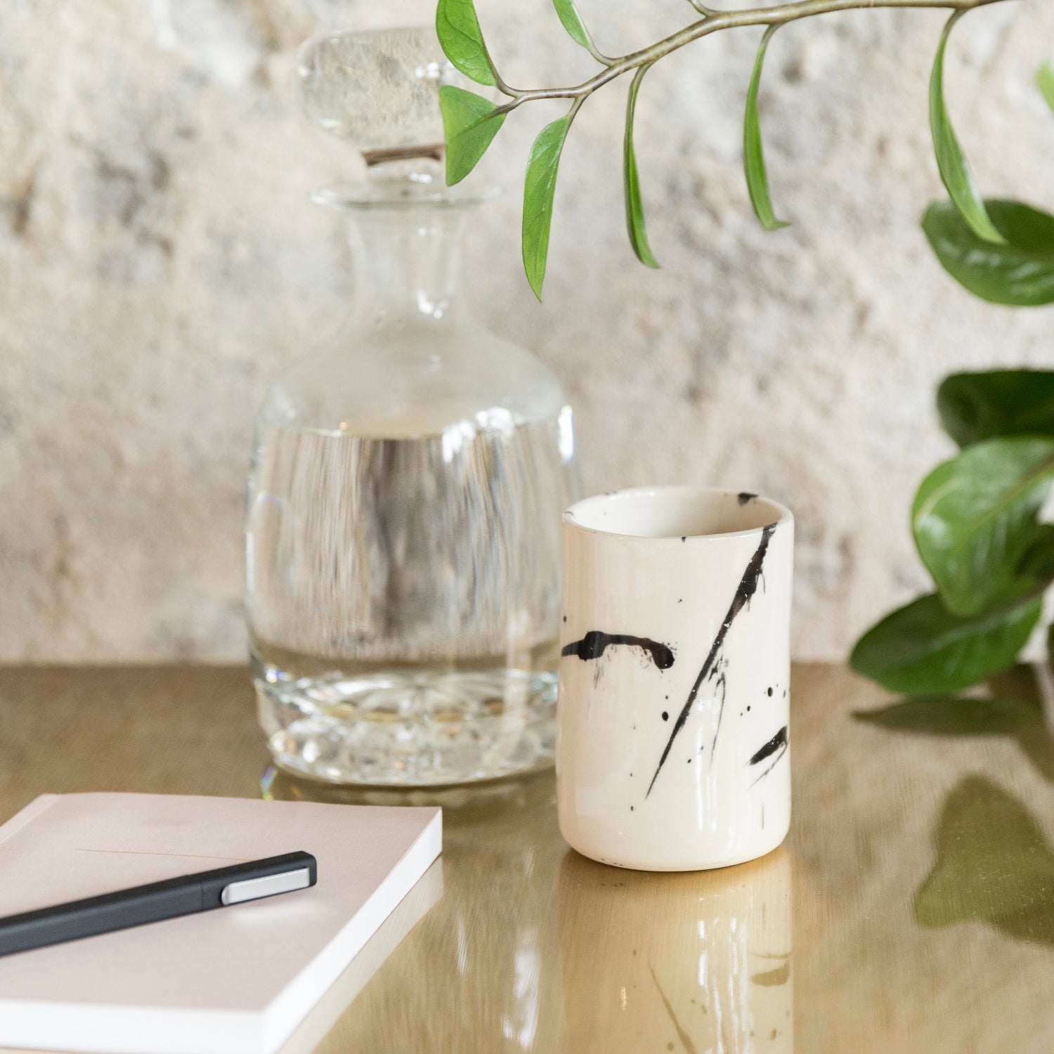 Available in indigo, black, deep green brush stroke splatter, or lilac brush stroke splatter.3” x 3” x 5"
