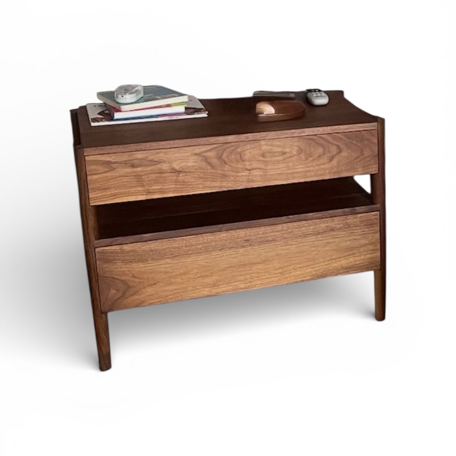 EARL Ebonized oak solid wood bedside table with two drawers and a shelf. Perfect nightstand next to any vintage or mid century modern style bed frame.